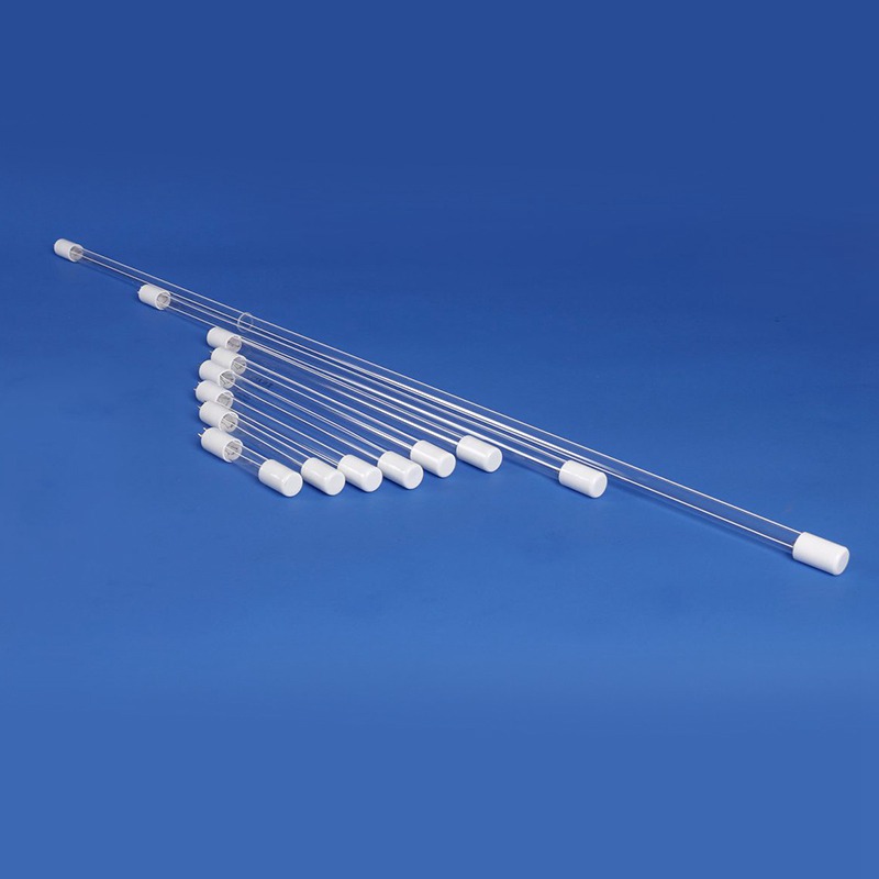 紫外线杀菌灯是由专业生产的高纯石英砂、以及自动控制连熔设备生产的标准型号透明石英玻璃管制成,纯度高、热稳定性能好、透过率 (UVT) 高,( 真空脱羟),羟基含量低。有发出 185nm 和 254nm 的透明纯石英玻管制成的高臭氧灯管和屏蔽185nm 辐射而高透 254nm 的石英玻管制成的无臭氧灯管。